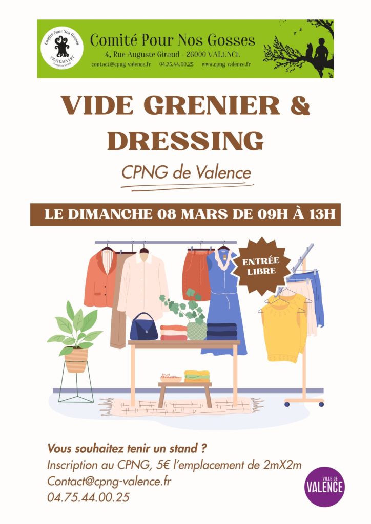 Le Comité Pour Nos Gosses (CPNG) de Valence organise un vide-grenier et vide-dressing le dimanche 8 mars, de 9h à 13h. Ouvert à toutes et tous, cet événement convivial est l’occasion de chiner vêtements, accessoires et objets du quotidien à petits prix, dans une ambiance chaleureuse et solidaire.